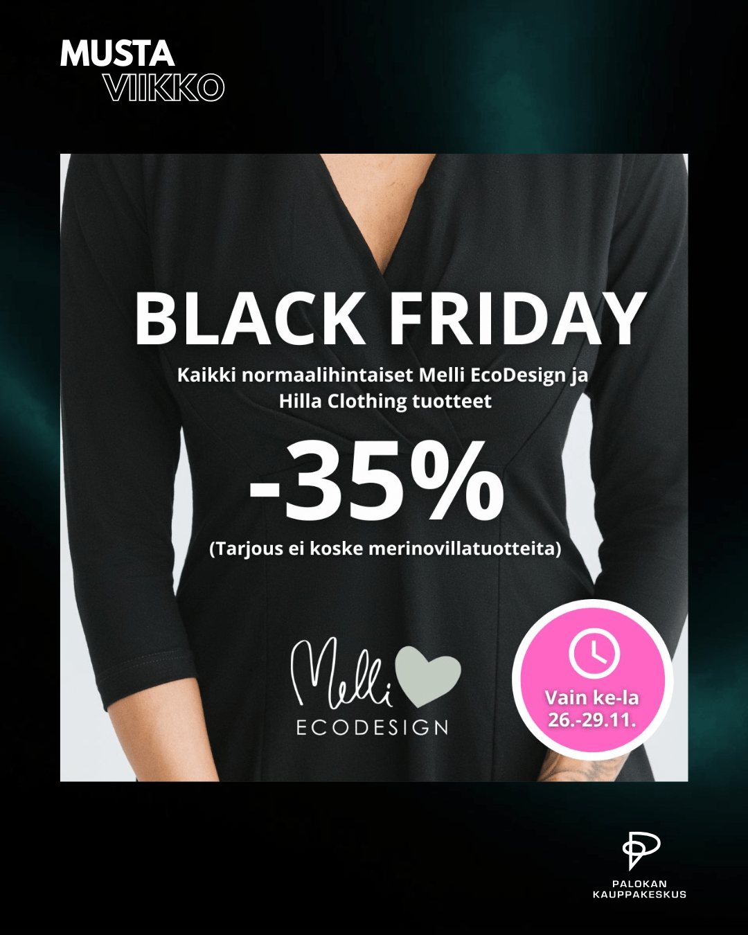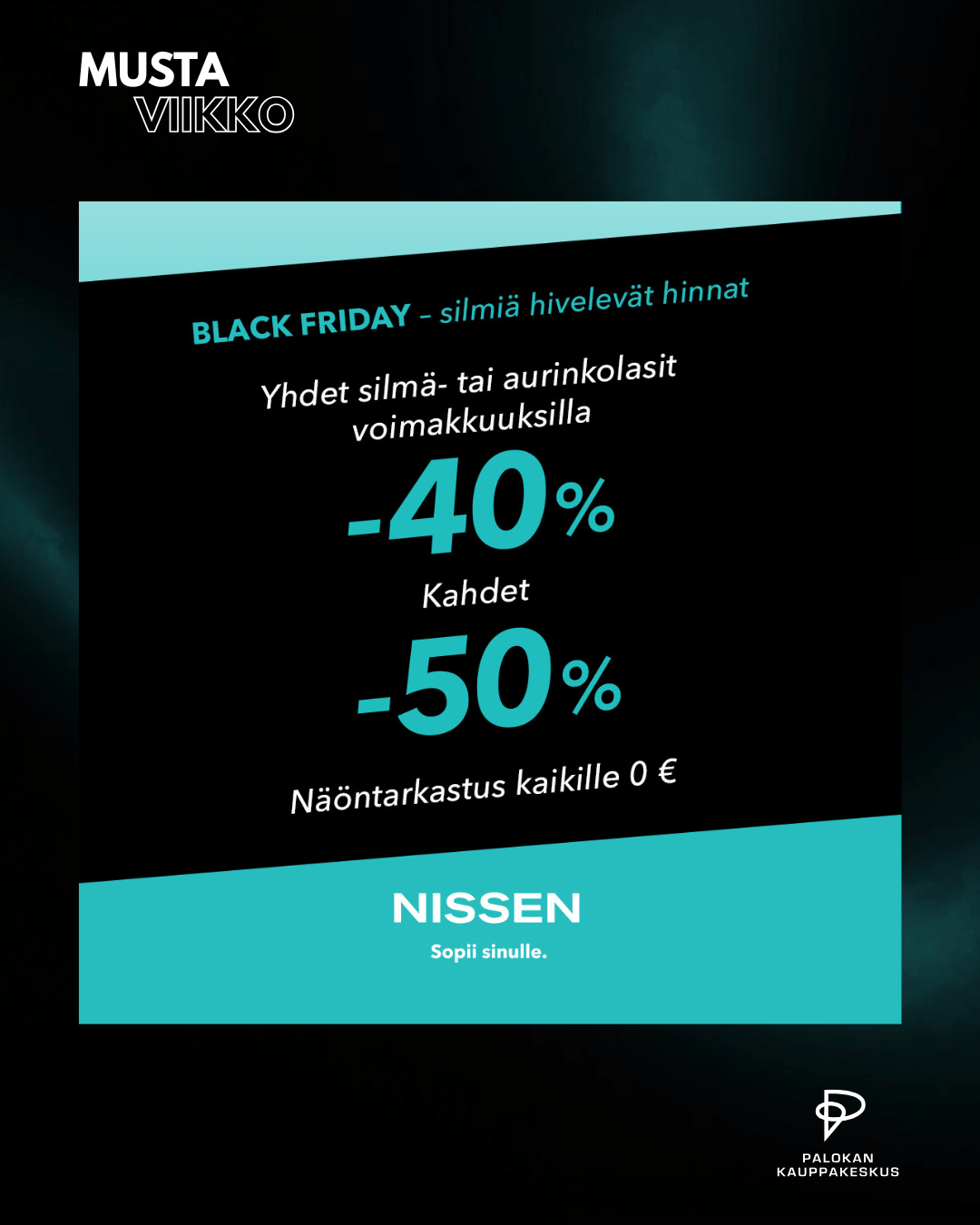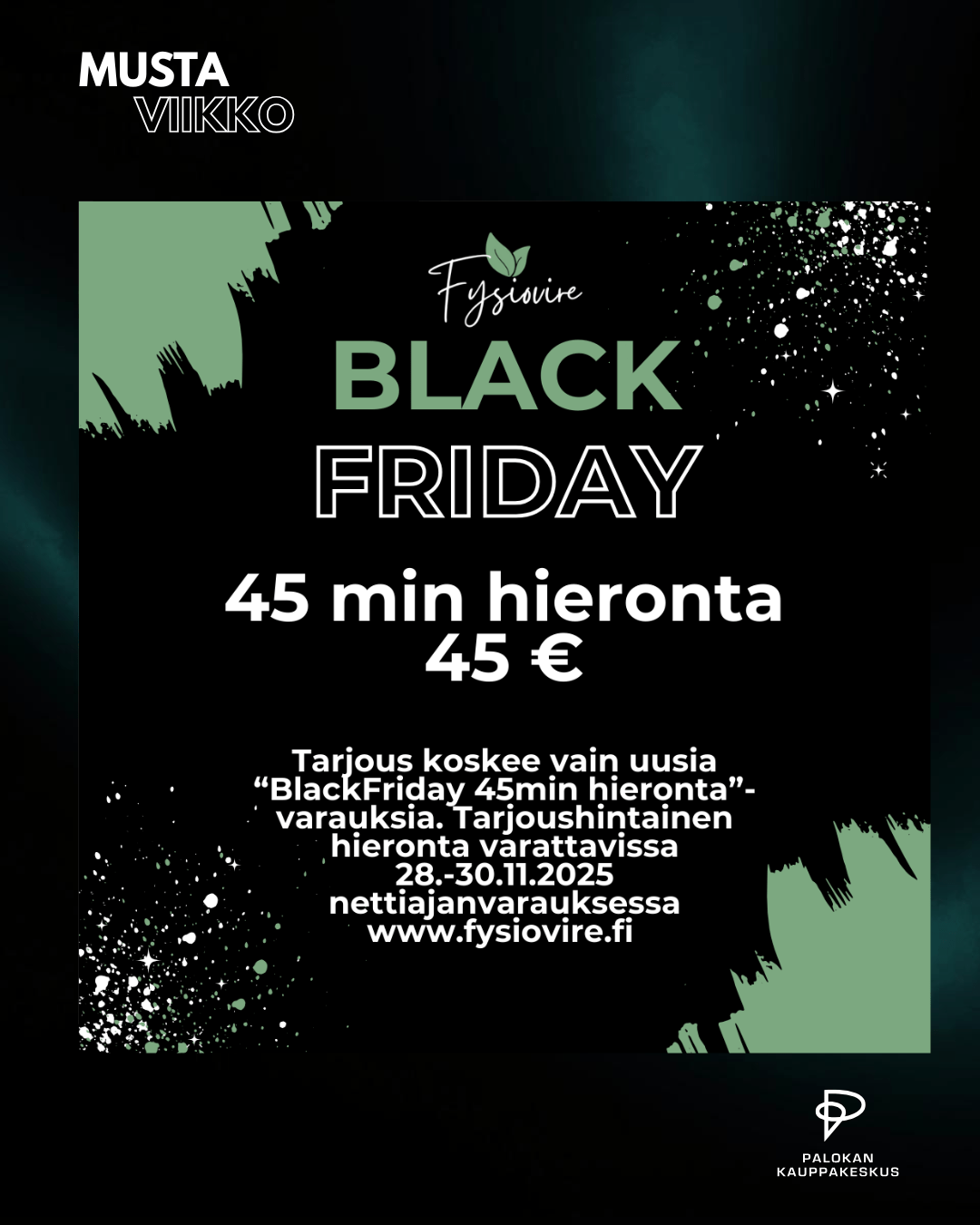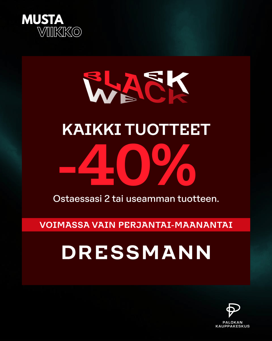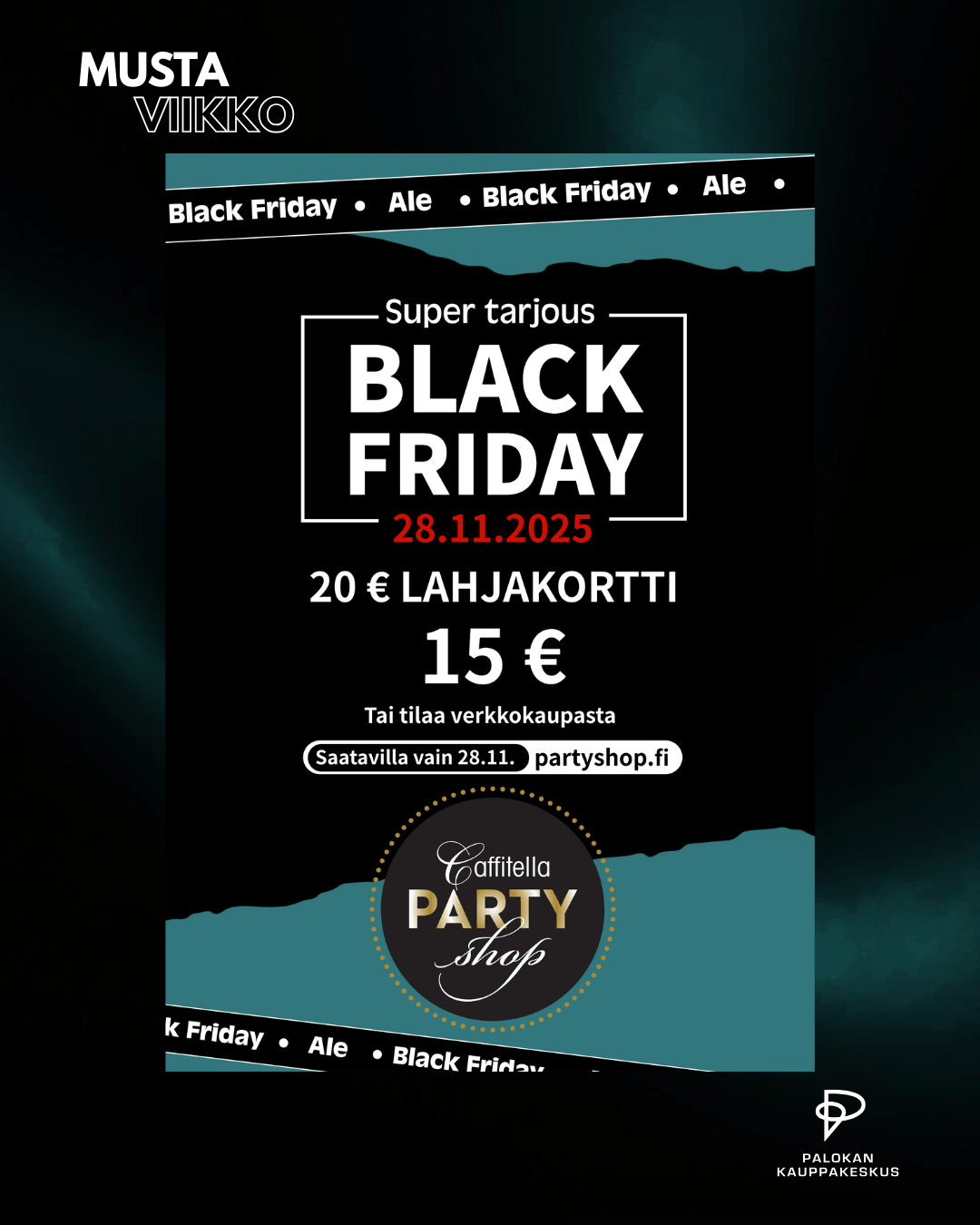 Musta viikko on käynnissä Palokan kauppakeskuksessa. Musta viikko ja tutummin black friday on täydellinen hetki tehdä edullisia hankintoja, löytää joululahjoja etukäteen tai piristää itseäsi pienellä ostoksella. Kauppakeskuksemme liikkeet ovat koonneet viikon ajaksi parhaat tarjouksensa. Selaa alta liikkeiden Black Friday -tarjoukset ja tule tekemään omat löytösi Palokan kauppakeskukseen!